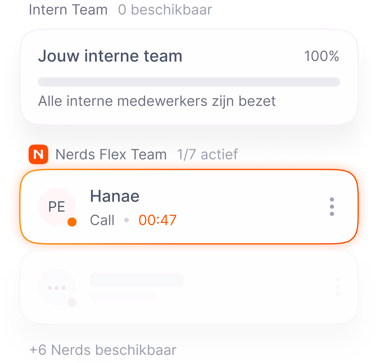 Onze Nerds vangen pieken, uitval en (tijdelijke) drukte op. We nemen calls en tickets over wanneer je eigen team niet genoeg capaciteit heeft, zodat je bereikbaarheid op peil blijft.